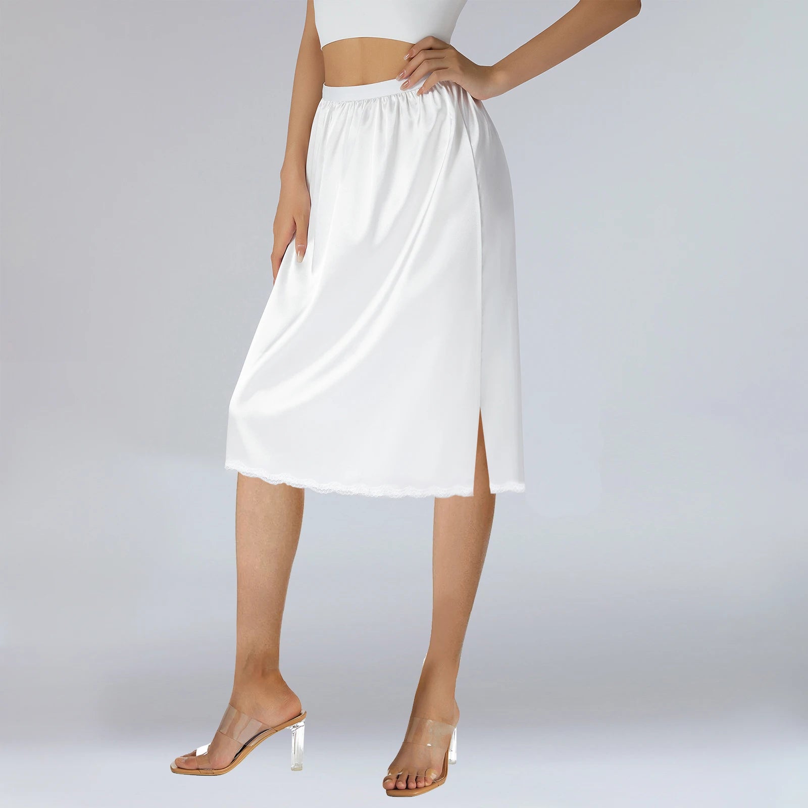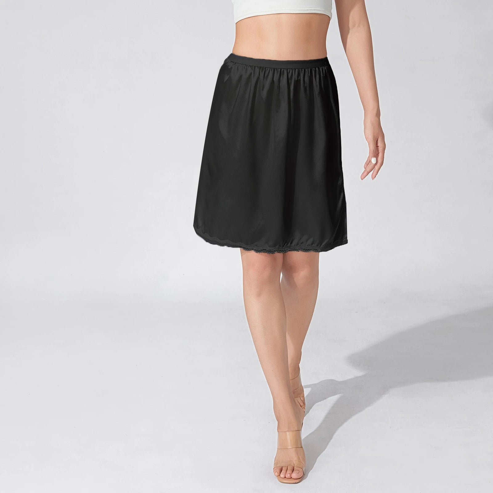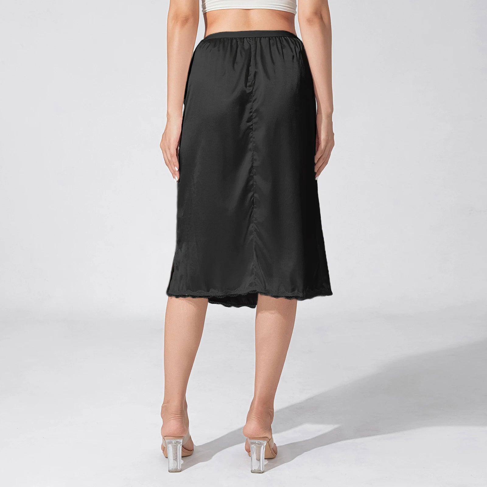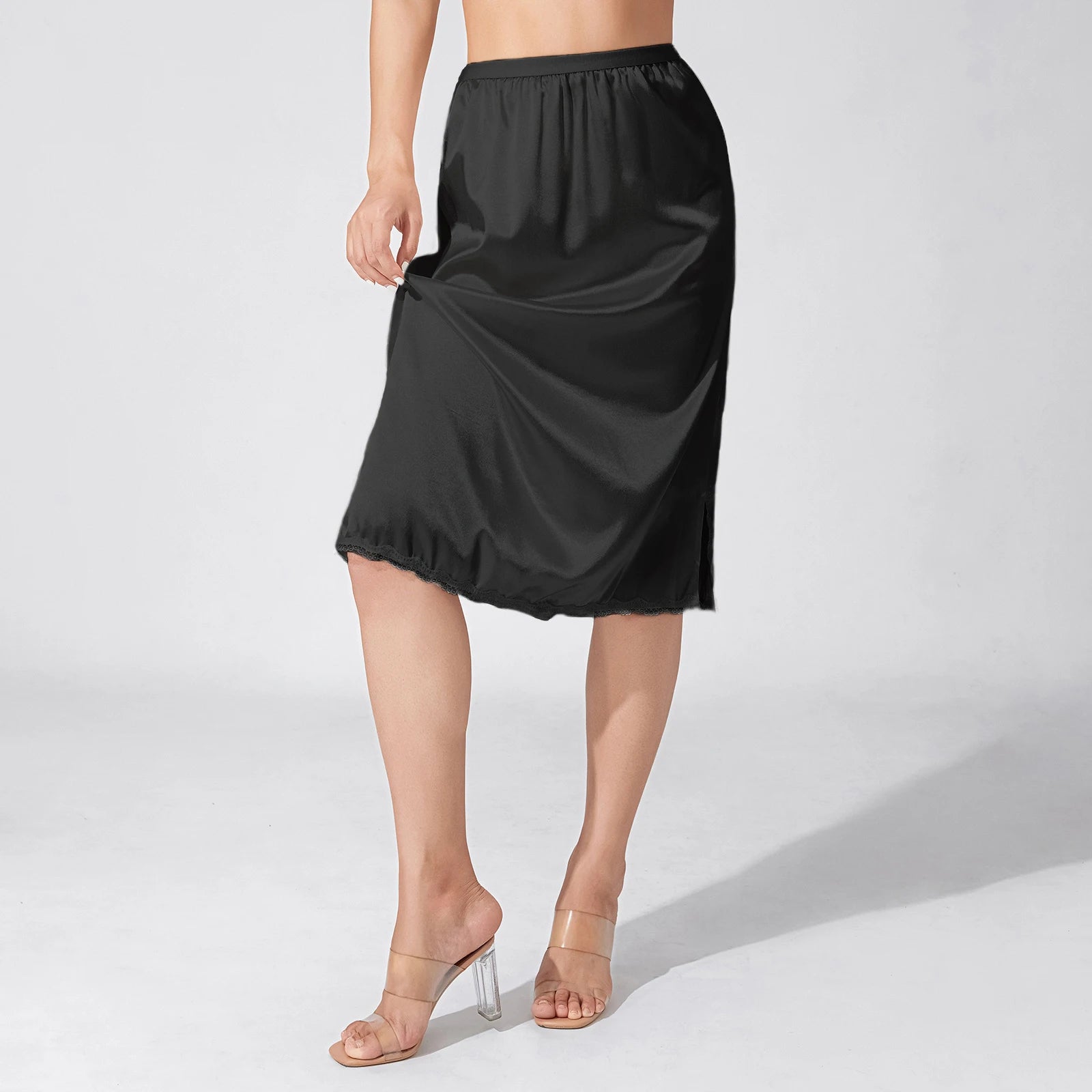 Women's Half Slips, Elastic Waist Solid Color Satin Underskirt Lace Trim Skirt for Under Dresses